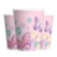 8 st. pappersmuggar i en ljusrosa färg med vita kanter och med motiv av vackra fjärilar bland blommor. Duka fram dessa för att göra dukningen extra fin när det vankas kalas. Muggarna är ca 10 cm höga och rymmer ca 250 ml.