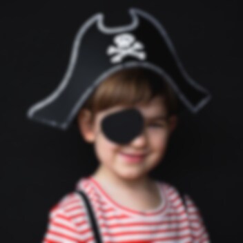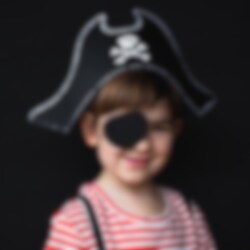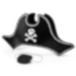 Pirathatt och ögonlapp av svart papper med vitt tryck.