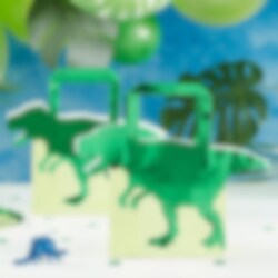 5 st. ljusgröna kalaspåsar av papper med motiv av en dinosaurie i grönfolie. Fyll påsarna med spännande godis och överraskningar och ge dem sedan till vännerna under kalaset. Påsarna är ca 20 x 15 cm stora.