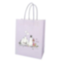 Presentpåse i ljuslila pastellfärg med ett sagolikt motiv från Mumindalen, där Mumin och hans vänner bjuder in till ett förtrollande kalas.