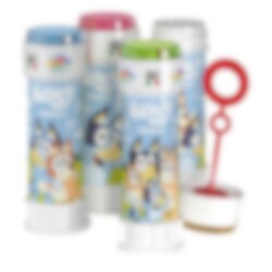 Såpbubblor där flaskan har färgglada motiv från Bluey. Såpbubblor är populära att få som en gåva på barnkalas och det är roligt blåsa bubblor tillsammans. Priset är per styck och flaskan innehåller 60 ml.