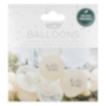 5 st. latexballonger med skriften "Hello Baby" på utsidan av 2 st. av ballongerna och där resterande ballonger även är fyllda med vit molnformad konfetti. Dekorera rummet med dessa för att göra det extra tjusigt inför babyshowern. Ballongerna är ca 30 cm i diameter uppblåsta och kan blåsas upp med vanlig luft eller helium.