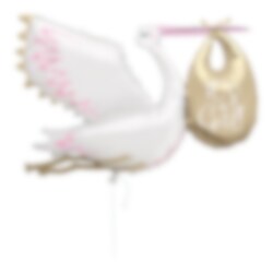 En mäktigt fin folieballong som föreställer en vit stork med guld- och rosafolierade detaljer som kommer med en guldfolierad kasse med skriften "It's a girl" i vit färg.