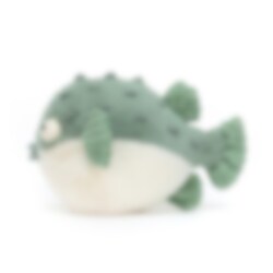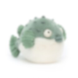 En häftig liten blåsfisk i grågrönt, turkost och gräddvitt som har som slogan att när livet blir tufft blir de tuffa puffiga. En härligt gosig och kramgo knubbis till fisk med bredrandig manchester på fenorna, mjuka knoppar på den övre halvan, puffiga läppar och lite utstående ögon. Denna roliga fisk är en bra myskompis med olika strukturer som rastlösa fingrar kan utforska. Tillverkad i polyester och handtvättas och plan- eller hängtorkas vid behov.