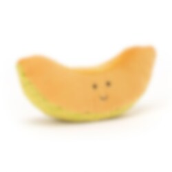 En kul mjuk leksak i form av en skiva cantaloupe melon med ett glatt leende. En kul och fruktig sak som det inte är många andra som har. melonskivan kan också användas när man leker affär, kök eller annat liknande. Tillverkad i 95% polyester, 5% spandex och handtvättas vid behov.