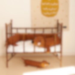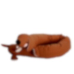Charmig tax med broderade detaljer och vackert rostbrun färg. Hunden kan användas som ett kul och annorlunda skydd i spjälsängen, som en rolig kudde eller som en kramgo kompis att slappa med för äldre barn. Tillverkad av ekologisk bomull och stoppad med polyester. (Oeko-Tex Standard 100). Tvättas i 30° skontvätt och hängtorkas.