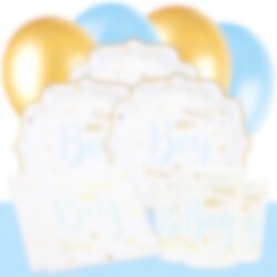 Detta färdiga kalaspaket till för babyshower eller dop inkluderar 10 stycken lyxiga tallrikar med guldfolierade kanter (21 x 21 cm), 10 st. söta pappmuggar (270 ml) och 20 st. vackra servetter med texten "Boy" (33 x 33 cm) utöver det så ingår 10 st. guldmetallic ballonger och 10 st. ljusblå ballonger samt en ljusblå bordsduk av plast (137 x 274 cm).