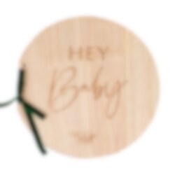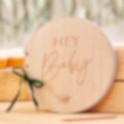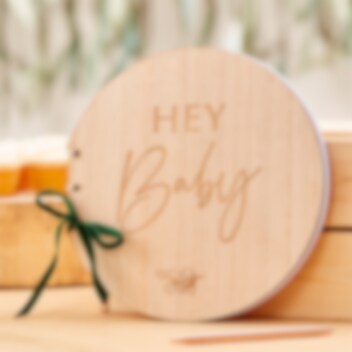 Rund gästbok i trä med tillhörande grön sammetsrosett och med motiv av texten "Hey Baby". Gästboken består av 32 blanka blad och är ca 21 x 22 cm stor. Boken kan med fördel användas på både dop och babyshower.