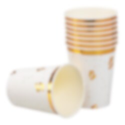 8 st. pappmuggar med motiv av guldfolierade avtryck av babyfötter samt prickar på en vit bakgrund. Muggarna har även en guldfolierad kant upptill. Ett riktigt gulligt tillbehör att duka fram inför babyshowern eller dopet. Muggarna är gjorda av FSC-papper, är ca 10 cm höga och rymmer ca 250 ml.