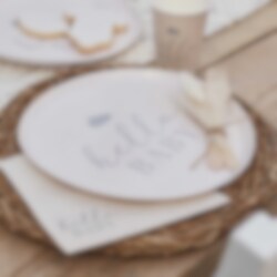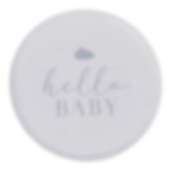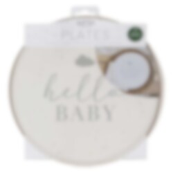 8 st. papperstallrikar i en fin neutral beige färg och med motiv av skriften "Hello Baby" i grått. Ett snyggt dukningskomplement till Baby showern. Tallrikarna är ca 24 cm i diameter.