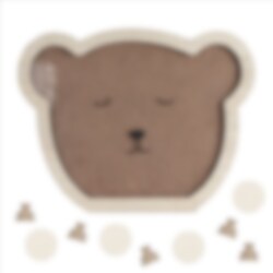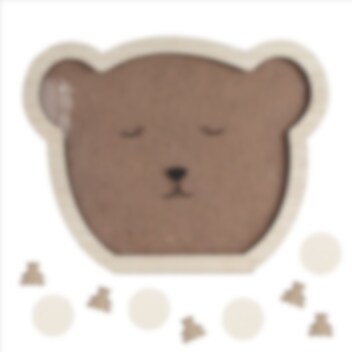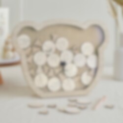 Gästbok har en träram formad som en teddybjörns ansikte där gästerna kan lägga i trämarker som lyckoönskningar. Ramen är 28 cm hög, 36,5 cm bred och 1,5 cm djup. Den kommer med 18 runda trämarker och 20 björnformade trämarker, perfekta för att skriva hälsningar på.