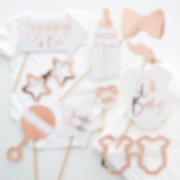 Förpackning med 10 st. olika photoprops i roséguldfolie med fina Babyshower motiv. Använd dessa när du och dina gäster ska ta några minnesvärda kort på Babyshowern.