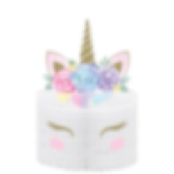 Bordsdekoration i honeycomb som liknar en tårta med enhörningsmotiv med vit som dominerande färg och detaljer i pastellfärger. En imponerande dekoration att pynta med inför babyshower med enhörningstema. Dekorationen är ca 19 x 30 cm stor.