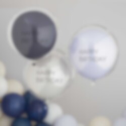 3 st. coola ballonger med dubbla lager i blå/grå nyanser och med texten Happy Birthday. Superfina att ha när det är dags att fira din födelsedag! Ballongerna kan blåsas upp med luft eller med helium och blir ca 45 cm i diameter som max uppblåsta.