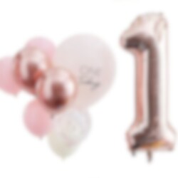 Riktigt fin ballongbukett i rosa och roséguld färg med 1-års tema. Dekorera rummet med denna inför 1-årskalaset. Förpackningen inkluderar