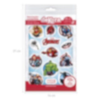 Förpackning med 13 st. sockerfria sockerdekorationer med snygga motiv från Marvels Avengers. Dekorera din tårta eller muffins med dessa när det vankas kalas. Du hittar även innehållsförteckningen nedan.