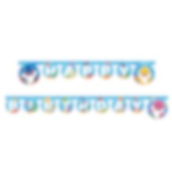 Pappgirlang i en blå färg med motiv av Baby Shark och hans familj samt texten "Happy Birthday " i vitt. Häng upp denna på väggen eller ovanför bordet inför kalaset med Baby Shark tema. Girlangen är ca 2 meter lång.