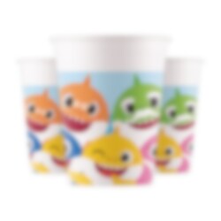 8 st. pappmuggar i fina färger med motiv av den söta hajen från den populära barnlåten Baby Shark. Ett roligt dukningskomplement till kalaset. Muggarna är ca 10 cm höga och rymmer ca 200 ml.