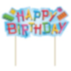 Superfin tårtdekoration i färgglatt byggkloss-tema med texten "Happy Birthday". Dekorationen är gjord av papp och är ca 18 x 20 cm stor.