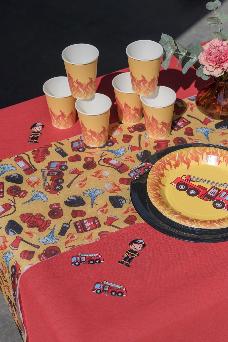 Förvandla kalasbordet till en spännande brandstation med denna färgglada bords löpare! Med detaljerade motiv av brandbilar, sirener, slangar och eldflammor skapas den perfekta atmosfären för små brandmän och brandkvinnor.