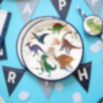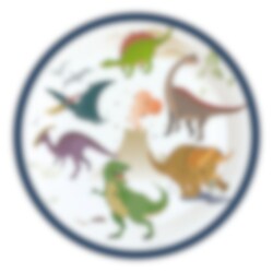 8 st. pappersassietter med blå kanter och ett färgglatt dinosauriemotiv på en vit bakgrund. Assietterna är ca 18 cm i diameter.