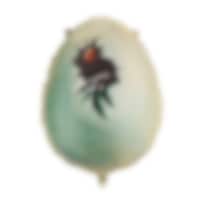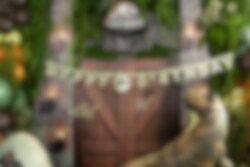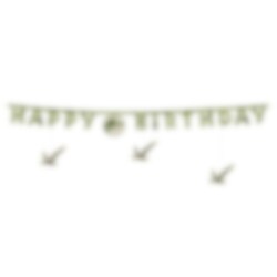 Girlangen är prydd med bokstäver som formar texten "HAPPY BIRTHDAY" i en distinkt grön nyans med texturerat mönster. Mellan orden hänger den ikoniska Jurassic World-logotypen med siluetten av en T-Rex.