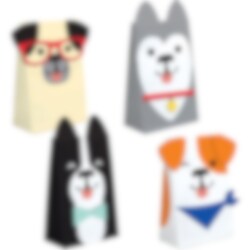 8 st. kalaspåsar av papper med motiv av 4 st. olika hundar. Fyll påsarna med godis och diverse leksaker och ge dem sedan till gästerna under kalaset. Påsarna är ca 20 x 11 cm stora.