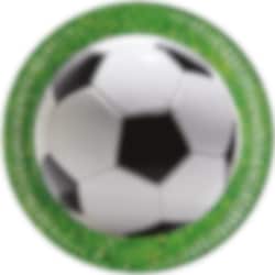 8 st. tallrikar av papper med coolt fotbollsmotiv. Lägg upp tårtan på dessa när du ska ha kalas. Tallrikarna är ca 23 cm i diameter.