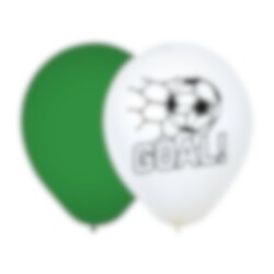 Skapa rätt stämning till fotbollskalaset med dessa festliga ballonger i grönt och vitt. Den vita ballongen är dekorerad med ett tydligt fotbollsmotiv och texten GOAL!, medan den gröna ballongen blir en snygg och passande kontrast som för tankarna till fotbollsplanen.