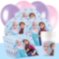 Detta färdiga kalaspaket med originaltillbehör från Frost inkluderar tallrikar (23 cm), pappmuggar (200 ml) och servetter (33 x 33 cm) för 8, 16 eller 24 personer. Utöver det så ingår 10 st. rosa ballonger och 10 st. ljuslila ballonger och en ljusblå bordsduk av plast (137 x 274 cm). I paketet för 24 gäster så ingår 2 st. bordsdukar.
