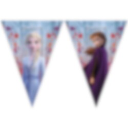 Söt flaggirlang av plast med vackert motiv av systrarna Anna och Elsa från Disneys film Frost 2. En imponerande dekoration till kalaset. Flaggirlangen är ca 2,3 meter lång.