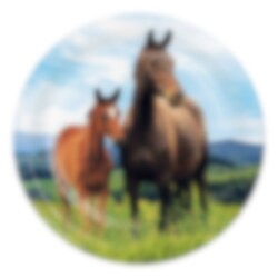 8 st. assietter med sött verklighetstroget motiv av ett sto tillsammans med sitt föl ute på en äng. Assietterna är tillverkade av papper och är ca 18 cm i diameter.