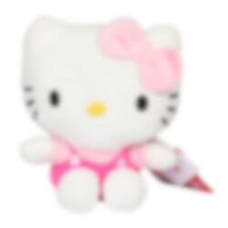 Den charmiga och älskade Hello Kitty är redo att sprida glädje och värme! Med sin klassiska rosa klänning, mjuka plysch och söta rosett är hon den perfekta kompisen för både lek och kramar.