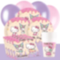 Detta färdiga kalaspaket med originaltillbehör i Hello Kitty inkluderar tallrikar (23 cm), pappmuggar (200 ml) och servetter (33 x 33 cm) för 8 eller 16 personer. Utöver det så ingår 10 st. rosa och 10 st. ljuslila ballonger och en ljuslila bordsduk av plast (137 x 274 cm).