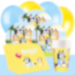Detta färdiga kalaspaket med originaltillbehör i Bluey tema inkluderar Bluey tallrikar (23 cm), Bluey pappmuggar (270 ml) och Bluey servetter (33 x 33 cm) för 8 eller 16 personer, utöver det så ingår 10 st. gula ballonger och 10 st. ljusblå ballonger och en ljusblå bordsduk av plast (137 x 274 cm).