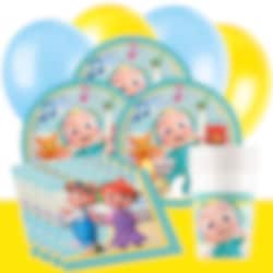 Detta färdiga kalaspaket med originaltillbehör i Cocomelon tema inkluderar tallrikar (23 cm), pappmuggar (200 ml) och servetter (33 x 33 cm) för 8 eller 16 personer, utöver det så ingår 10 st. gula ballonger och 10 st. ljusblå ballonger och en gul bordsduk av plast (137 x 274 cm).