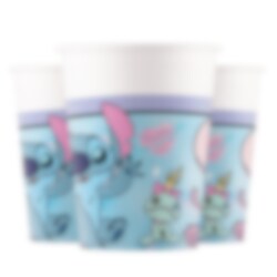 8 st. pappmuggar med söta motiv av Stitch & Angel och deras busiga kompis Scrump mot en ljusblå bakgrund. Perfekta när du vill få till en enhetlig och drömlik dukning på kalaset med Stitch & Angel-tema.