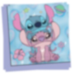 20 st. servetter med kärleksfullt motiv av Stitch & Angel mot en lila-blå stjärnhimmel, perfekta när du vill få till en enhetlig och drömlik dukning på kalaset med Stitch & Angel-tema.