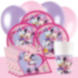 Detta färdiga kalaspaket med originaltillbehör i Mimmi Pigg inkluderar tallrikar (23 cm), pappmuggar (200 ml) och servetter (33 x 33 cm) för 8, 16 eller 24 personer. Utöver det så ingår 10 st. rosa och 10 st. ljuslila ballonger och en ljusrosa bordsduk av plast (137 x 274 cm). I paketet för 24 gäster så ingår 2 st. bordsdukar.