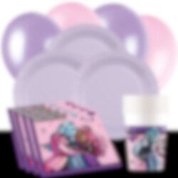 Detta färdiga kalaspaket med inkluderar lavendelfärgade papptallrikar (22,5 cm), Monster High pappmuggar (200 ml) och Monster High servetter (33 x 33 cm) för 8 eller 16 personer, utöver det så ingår 10 st. rosa och 10 st. ljuslila ballonger och en svart bordsduk av plast (137 x 274 cm).