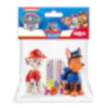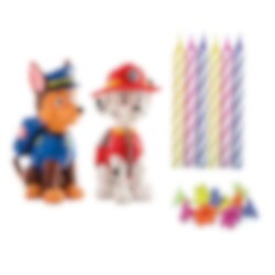 2 st. tårtfigurer som föreställer Chase och Marshall, samt 10 st. färgglada tårtljus med tillhörande hållare. Tårtfigurerna är 6 cm höga och tillverkade av plast, medan tårtljusen är 6 cm höga.