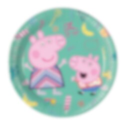 8 st. pappassietter i mintgrön färg med motiv av Greta och hennes bror George Gris från den populära barnserien Greta Gris - Peppa Pig. Ett givet komplement till kalasdukningen inför kalaset med Greta Gris som tema. Assietterna är ca 20 cm i diameter.
