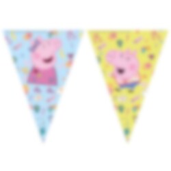 Flaggirlang i blått och gult med snyggt motiv av Greta och George Gris från den populära TV-serien Greta Gris - Peppa Pig. En fin dekoration att pynta kalasrummet med. Flaggirlangen är tillverkad av plast och är ca 2,3 meter lång.
