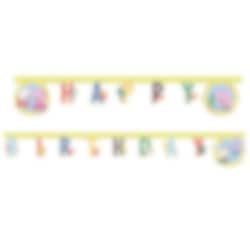 Vacker gul girlang av papp som bildar ordet "Happy Birthday" i färggranna färger och med motiv av Greta Gris och hennes vänner från serien Greta Gris - Peppa Pig. Häng upp denna girlang på väggen för en trevlig dekoration till kalaset. Girlangen är ca 2 meter lång.