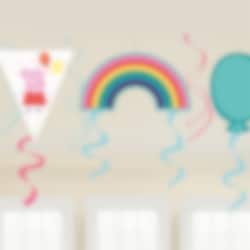 3 st. vackra hängande dekorationer med 3 st. tillhörande swirls med kul Peppa Pig motiv. En häftig dekoration att ha i kalasrummet när du ska ha kalas med Peppa Pig som tema. Ca 45 cm långa.