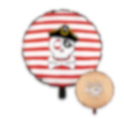 Ge piratkalaset en lekfull och festlig detalj med denna fina folieballong i pirattema. Ballongen har motiv med dödskalle, pirathatt och röda ränder på ena sidan, medan den andra sidan pryds av texten "Hip Hip Ahoy!" på en bakgrund som för tankarna till en gammal skattkarta.