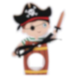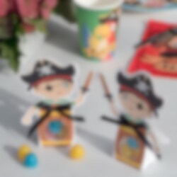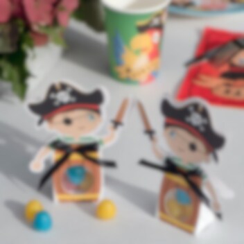 6 st. små askar som föreställer en cool pirat som sitter i en brun tunna. Fyll dessa med något gott och placera ut på bordsplatsen som en kul överraskning till dina på piratkalaset.