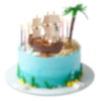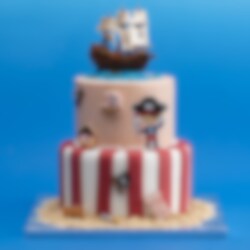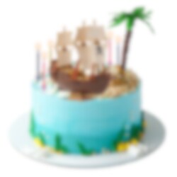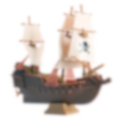 Tuff tårtdekoration formad som ett piratskepp med vita segel och dödskallar. Passar jättebra att dekorera tårtan med på ditt piratkalas. Din tårta kommer att sticka ut. Piratskeppet är ca 12 x 12 cm stort.
