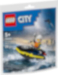 Patrulläventyr över brusande vågor väntar i setet LEGO® City Polisvattenskoter, som innehåller en polisminifigur med flytväst, hjälm och handbojor.