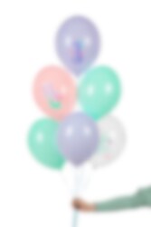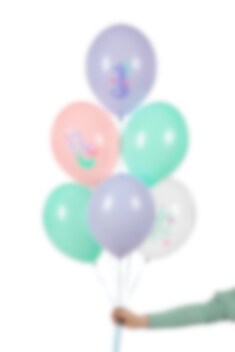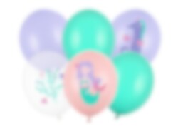 Förpackningen innehåller 2 st. ballonger i turkos färg, 2 st. ljuslila ballonger med en ballong som har motiv av en sjöhäst, 1 st. ljusrosa ballong med motiv av en sjöjungfru och 1 st. transparent ballong med motiv av en havsblomma.